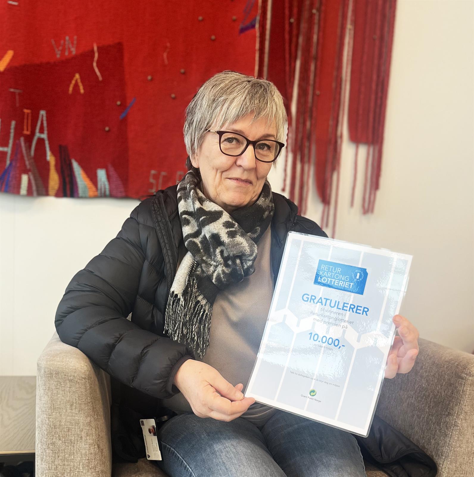 Gratulerer til Synnøve Remøy Hasund frå Ulsteinvik, som har vunne 10 000 kr i Returkartonglotteriet!